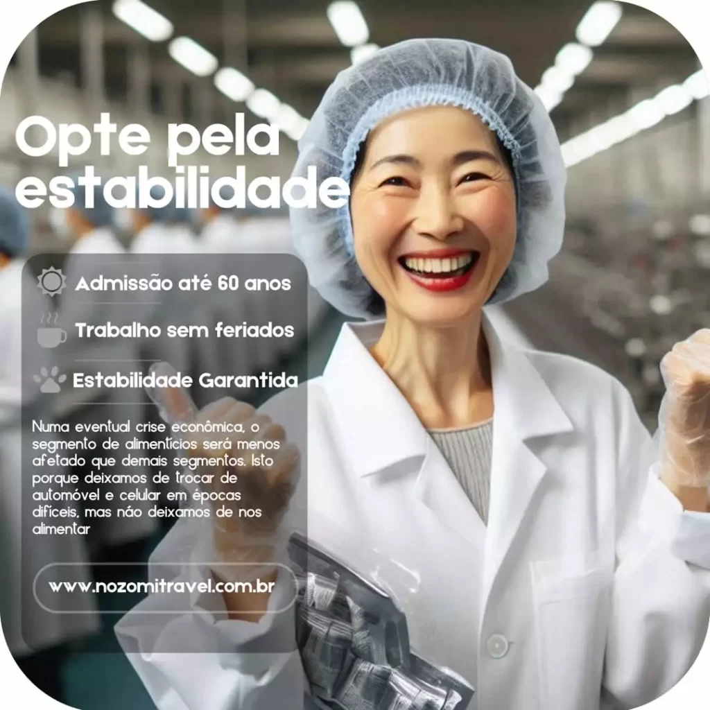 Musashino, gigante do segmento de alimentícios japonês. A empresa conta com fábricas nas seguintes províncias: Tochigi, Miyagi, Chiba, Gunma (2 fábricas), Saitama (9 fábricas), Kanagawa (2 fábricas), Tóquio, Shizuoka (2 fábricas), Osaka (2 fábricas), Hyogo, Hiroshima, Fukuoka (2 fábricas ), Okinawa. Produz os seguintes itens: linha de pães, sanduíche, oniguiri, linha de macarrão, pratos prontos e congelados. O turno é fixo (diurno ou noturno), calendário 5 x 2, descanso no meio da semana. Caso opte pelo turno diurno o salário será 1200/h. Caso opte pelo turno noturno, 1200/h, porém 1500/h das 22:00 às 05:00. Ao completar 8 horas de serviço, as demais horas terão 25% de acréscimo, remunerando 1500/h.